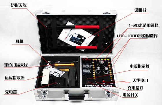 該探測(cè)系統(tǒng)是完全裝置在一個(gè)鋁箱子里,里面包含傳輸器,傳輸天線,接收器,掃描槍接收天線,110伏的充電電池,標(biāo)記小旗子和用戶手冊(cè)。
